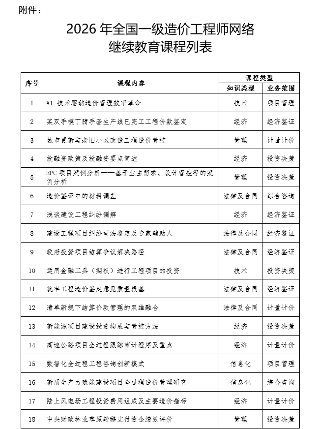 附件下载:关于开展2026年全国一级造价工程师继续教育工作的通知