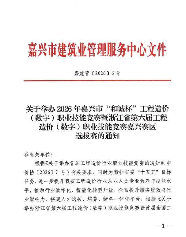 关于举办2026年嘉兴市“和诚杯”工程造价(数字)职业技能竞赛暨浙江省第六届工程造价(数字)职业技能竞赛嘉兴赛区选拔赛的通知