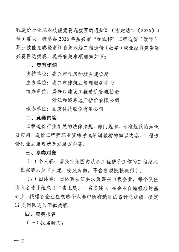 关于举办2026年嘉兴市“和诚杯”工程造价(数字)职业技能竞赛暨浙江省第六届工程造价(数字)职业技能竞赛嘉兴赛区选拔赛的通知