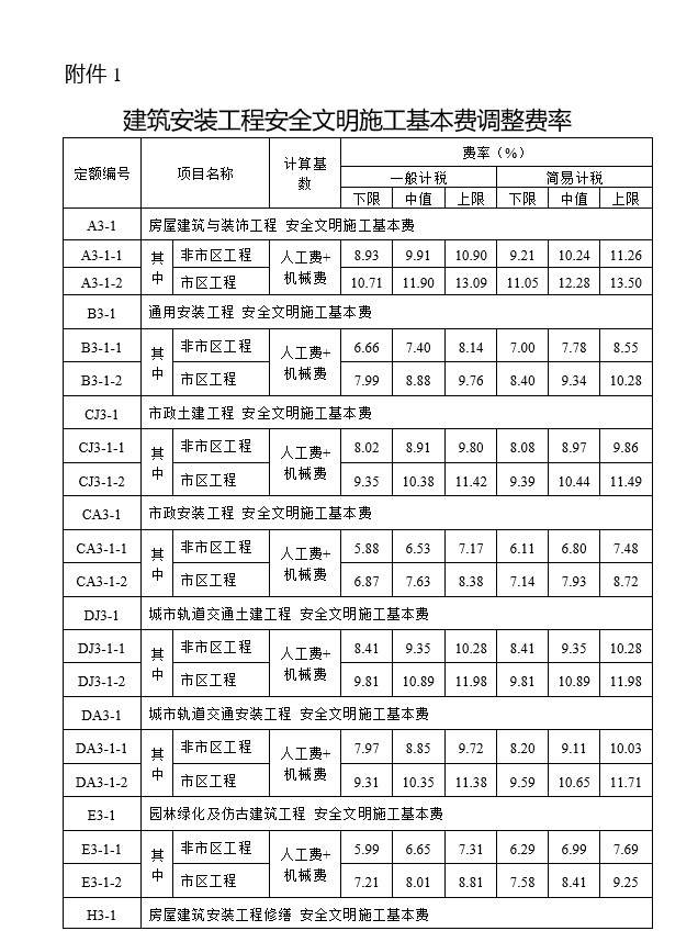附件:1.建筑安装工程安全文明施工基本费调整费率